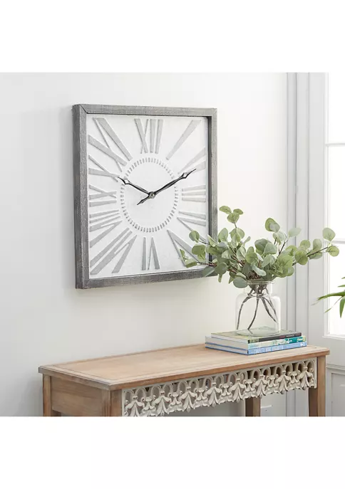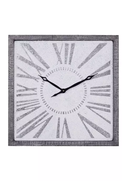 Large square wall clockGalvanized metal clock face with wood frameGray finish throughout with black clock handsSuits contemporary and some traditional style spacesLarge gray wall clock measures 25″L x 2″W x 25″H and weighs 5.5 lbs.