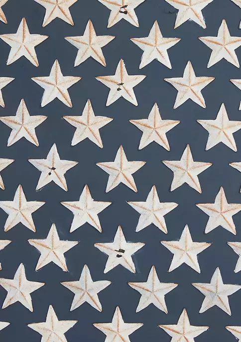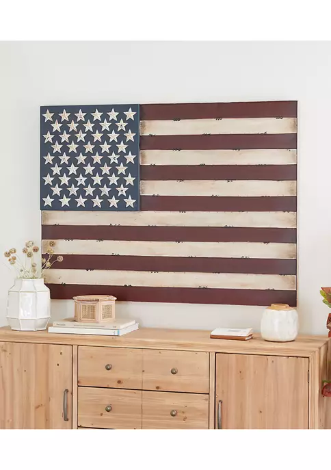 Enhance your farmhouse inspired home with classic style and a touch of cozy appeal. A decorative distressed American flag made of solid and textured iron material. This American flag wall decor features rectangular-shaped frame with horizontal pattern along with distressed red, blue, and white finishes. This large-sized American flag metal wall art features a rustic style flag with edged stars and black rust body highlights. Flag measures 48″L x 1″W x 36″H and weighs 17 lbs