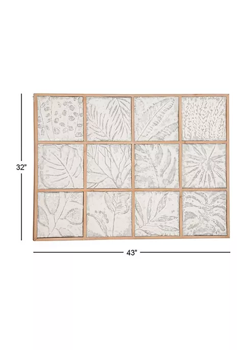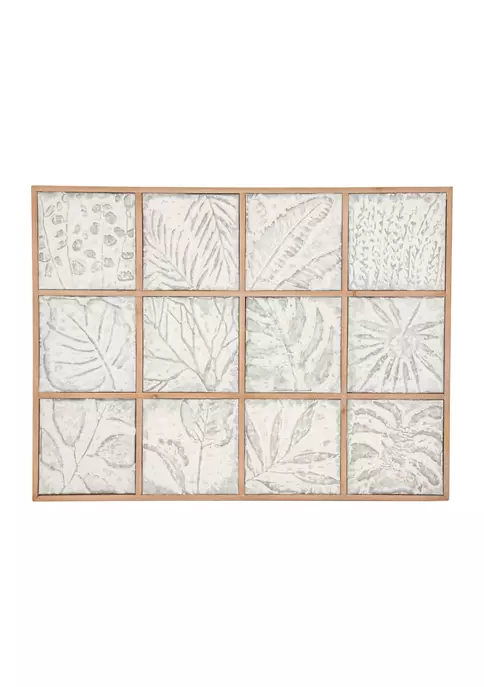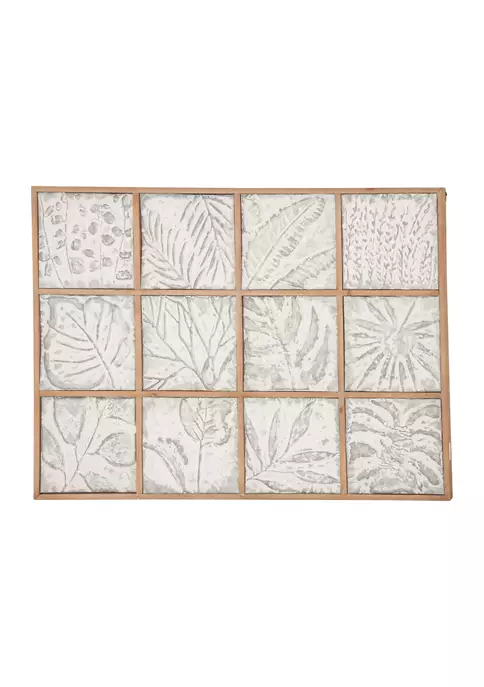 Enhance your farmhouse inspired home with classic style and a touch of cozy appeal. Item is made of natural fir wood frame with iron wall art tiles. This farmhouse wall decor highlights heavily whitewashed gray finish with natural wood brown frame finish. Large metal wall decor with 12 gray tiles with plant illustrations in wood frame. Metal and wood wall decor measures 43″L x 1″W x 32″H and weighs 3.5 lbs.