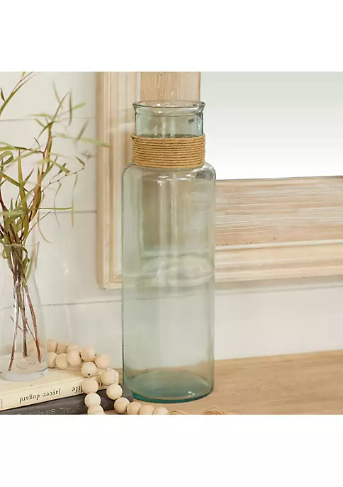 Enhance your farmhouse inspired home with classic style and a touch of cozy appeal. Made of glass and raffia palm. Item features a clear blue glass finish. Features a natural brown raffia rope neck design, a tall cylindrical jar with a funnel spout mouth made of glass material. Measurements: 6″L x 6″W x 18″H, weighs 6.13 lbs