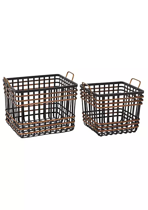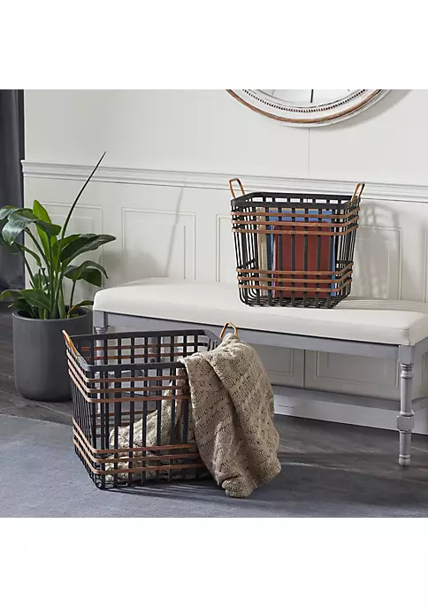 Enhance your farmhouse inspired home with classic style and a touch of cozy appeal. Each farmhouse storage basket is woven with bamboo and metal. These storage baskets highlight copper and black finish with soft sheen. Each farmhouse storage basket features woven grid patterns extending to 2 side handles. Storage basket measures 14″L x 18″W x 16″H, 24″L x 17″W x 18″H and weighs 5 lbs