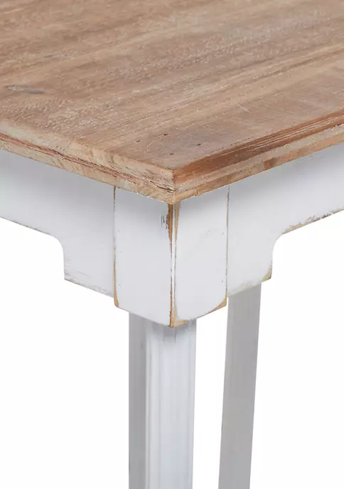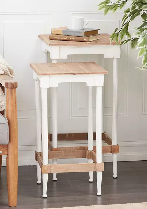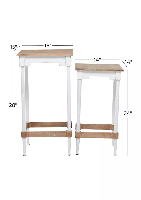 Enhance your farmhouse inspired home with classic style and a touch of cozy appeal. A stunning set of 2 brown side tables crafted of robust wooden material for long-lasting use. A set of square side tables featuring brown wooden top and leg supports with a distressed white frame. A set of 2 white and brown side tables highlighting square wooden tops and long slim legs with bracket supports. Items measure 15”L x 15.10”W x 28.60”H and 13.70”L x 13.70”W x 24.05”H; collectively weighs 14.42 lbs