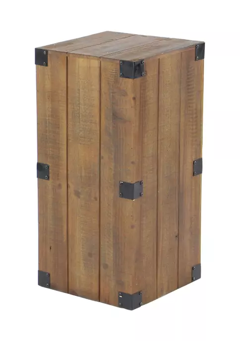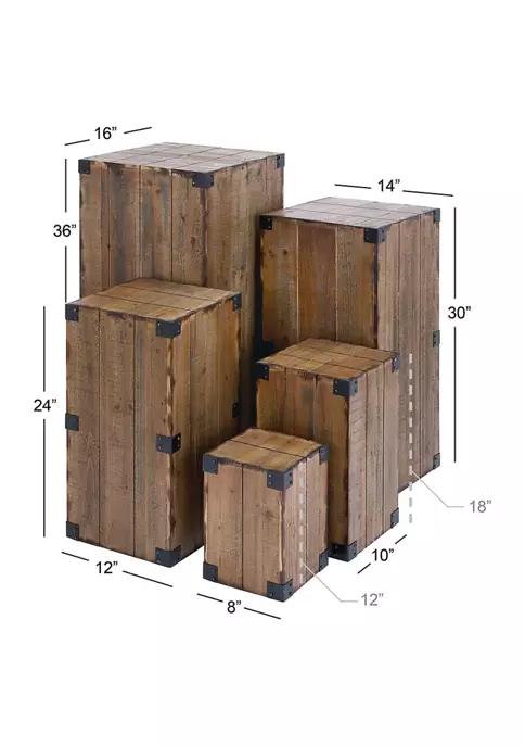 These wooden pedestal tables are great corner posts, vertically or horizontally placed, for accent pieces like flower vases and trophies. Use it as an accent piece in the living room, library, home office, waiting areas, or hallways of you home. A practical yet stylish upgrade that instantly elevate the look of your room. Suitable for indoor use only. Maximum weight limit is 25 lbs. This set includes 5 pedestal tables. Farmhouse theme.