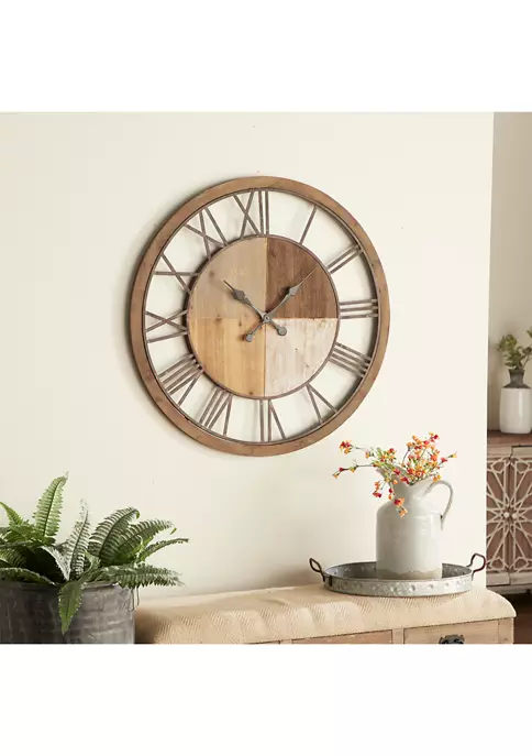 Designed with a farmhouse inspired theme for an inviting and wholesome aestheticThis round decorative mirror is crafted of polished and solid cypress wood and ironWhitewashed, gray washed, golden beige, and mocha brown wood tone finishes with distressed brown metalThis large round wall clock features iron cut-out Roman numerals and quadrant style clock centerExtra large wall clock measures 36″L x 1″W x 36″H and weighs 15.4 lbs.