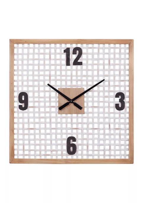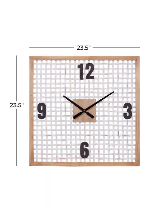 Light beige natural wood, white wood clock face, and black numerals and clock handsSuits farmhouse style spacesSquare farmhouse wall clock measures 23.5″L x 1.5″W x 23.5″H and weighs 2.3 lbs.