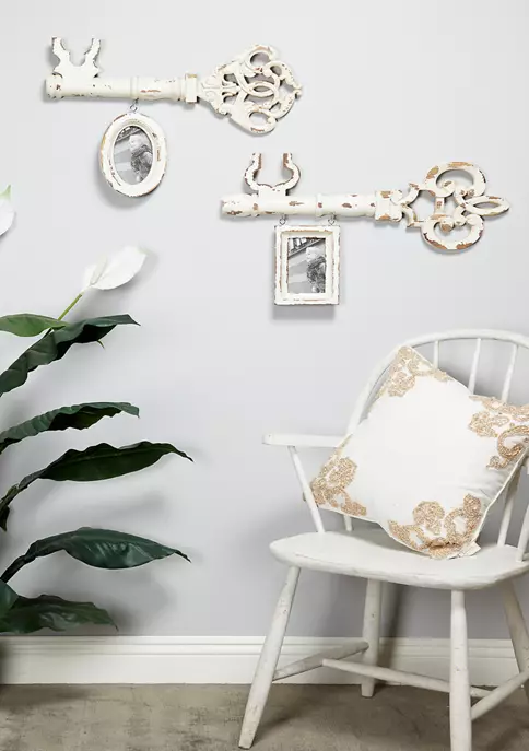 Antique charm and finish: The ornate, skeleton key shape and heavily distressed and decoratively chipped paint that reveals the golden-brown wood creates an authentic vintage feel with dense texture.