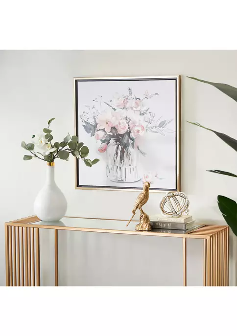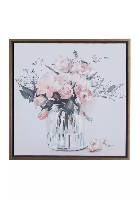 A French country inspired style strikes a balance between rustic and elegant. This endearing flower canvas wall art is crafted from polystone, iron, Chinese fir wood, and canvas fabric. This tan framed canvas wall art features a glass flower vase with an array of pink, purple, and white flowers. This captivating framed flower wall art features a soft-toned flower vase painting with an enchanting long stem floral arrangement. This framed canvas art measures 24″W x 24″H