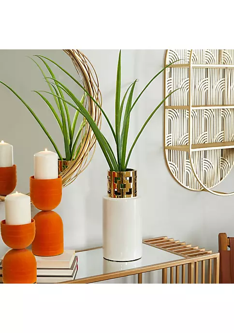 Elevate your space and add a touch of luxury with this glam inspired piece. Stoneware gives this vase a solid and durable form. Metallic gold and glossy white finish flaunts this ceramic decorative vase. Geometric cut-out patterns adorn the golden neck of this glossy white cylinder vase. Item measures 5″L x 5″W x 12″H and weighs 3 lbs