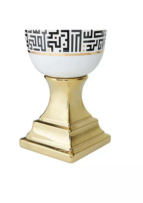 Elevate your space and add a touch of luxury with this glam inspired piece. A white and gold ceramic vase crafted of robust and lasting dolomite. This glam decorative vase comes in a white exterior with black details along with a gold stand. This goblet inspired decorative vase for home decor features a tall cylindrical structure with eye-catching black abstract pattern with gold band details supported by a gold tiered square stand. Item measures 7″L x 7″W x 21″H and weighs 5 lbs