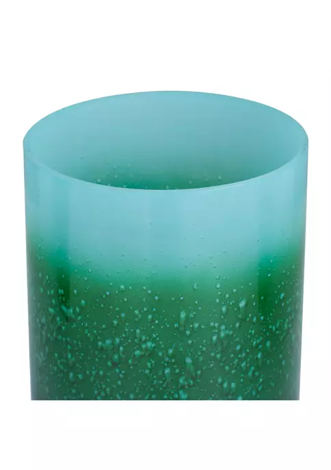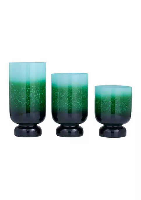 Elevate your space and add a touch of luxury with this glam inspired piece. These home decor are crafted with bubble glass for a solid and durable form. Votive candle holders highlight an elegant green, turquoise, and black ombre design with a smooth bubbled-inspired look. Each candle holder features a hurricane figure set on a tapered base stand and tinted with light to dark tone for an eccentric look. Measure 6″D x 12″H, 6″D x 10″H, 6″D x 8″H and collectively weigh 8 lbs