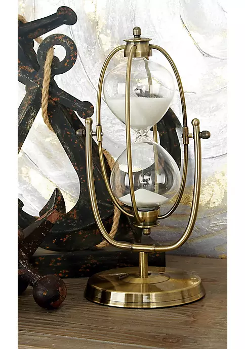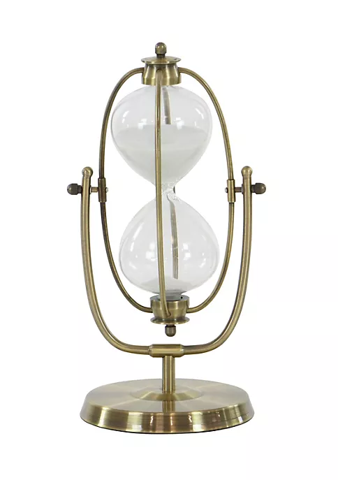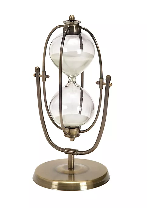 Elevate your space and add a touch of luxury with this glam inspired piece. This hourglass’ sturdy and durable frame/body is made of solid iron material. This unique hourglass timer features a polished brass metal finish, a clear glass finish, and a white-colored sand timer. Features a round base that provide stability and balance to the hourglass. Small hourglass decor measures 13โ in length, 6″ in width, 6″ in height and weighs 3.2 lbs