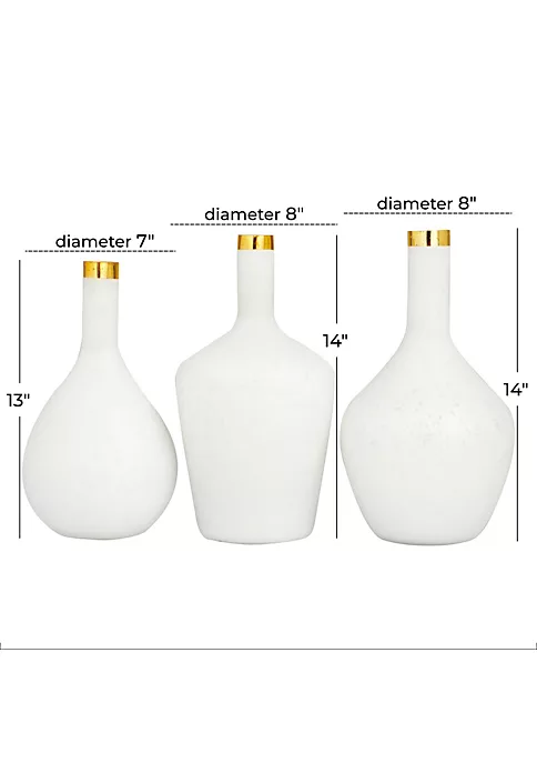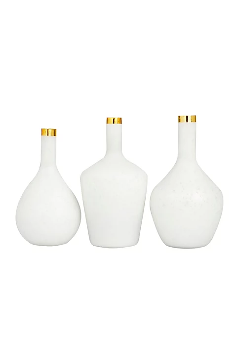 Elevate your space and add a touch of luxury with this glam inspired piece. These glass vases for decor are constructed of robust and lasting glass material. This glass glam style vase set highlights white and gold finishes that create an elegant appeal in your interior. A set of 3 white glass vases featuring different body shapes with smooth coatings along with small mouth openings with gold rims. This decorative vase set measures 6.95″L x 6.95″W x 13.45″H, 7.70″L x 7.70″W x 13.65″H, 6.80″L x 6.90″W x 12.55″H and weighs 7.38 lbs