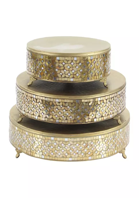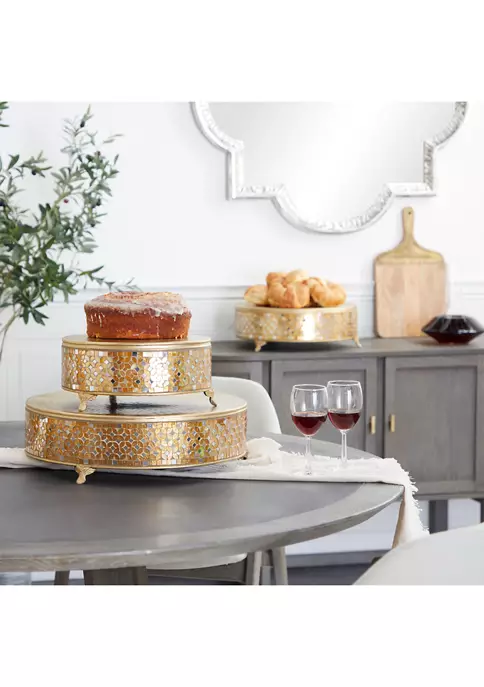 Elevate your space and add a touch of luxury with this glam inspired piece. A set of decorative cake stands crafted of solid iron and glass. With its gold finish, this set of cake stands brings charm to your table. Features 3 cake stands with flat metal tops and ornate scroll feet. Cake stand measures 18.50βL x 5.55βH, 16.50βL x 5.55βH, and 12.50βL x 5.65βH and weighs 12 lbs