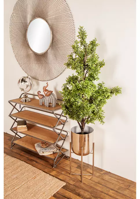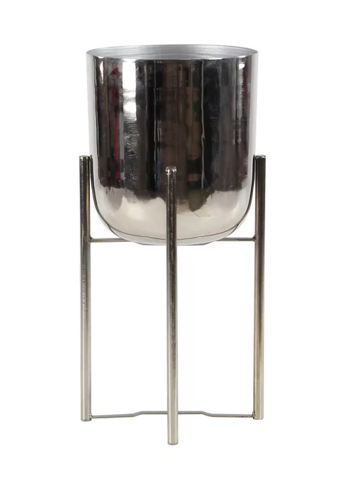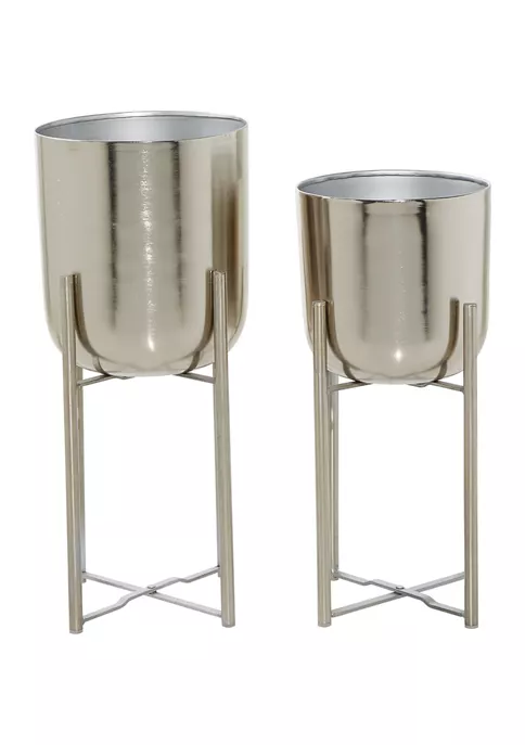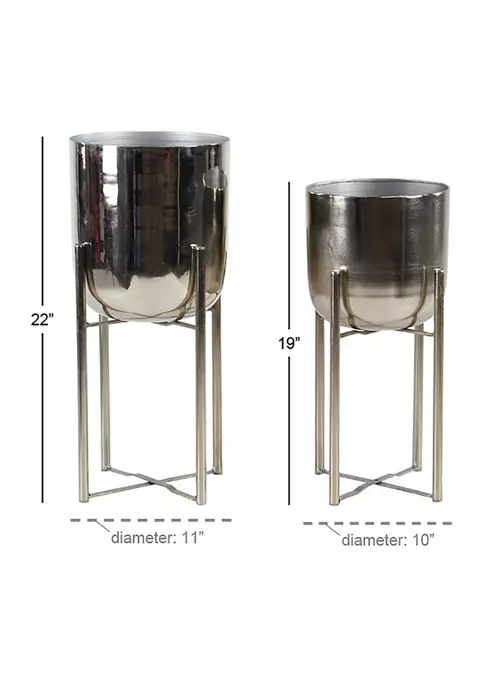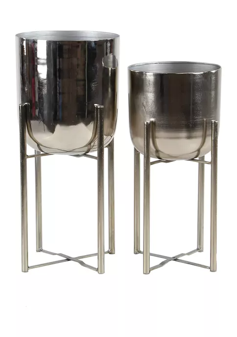 Set of 2 contemporary 19″ and 22″ iron planters, crafted from 100% iron material, features cylindrical bodies with tapered round bottoms, supported by a sturdy frame formed by an X-shaped brace and four long legs, comes in a silver finishing.
