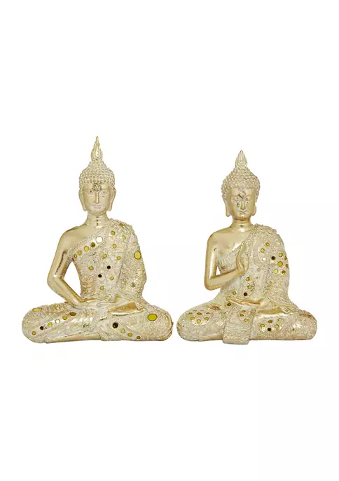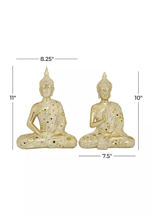 Elevate your space and add a touch of luxury with this glam inspired piece. Polystone resin was given a shiny metal finish in these Sitting Buddha sculptures. Features a soft matte gold finish with intricate detailing and embellishments. Design works best with light and neutral colors in any interior concept. The items in this set measure 7.55″L X 5″W X 10″H and 8″L X 4″W X 11″H and collectively weigh 3.94 lbs