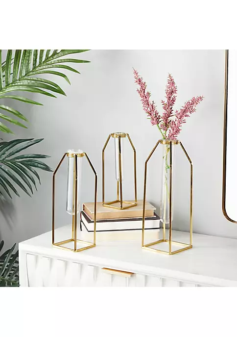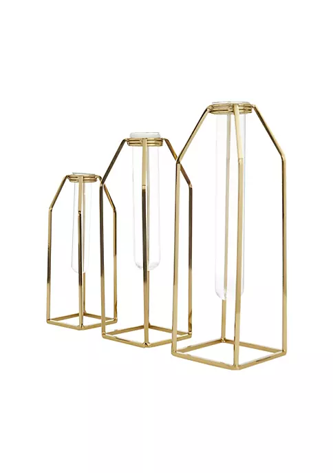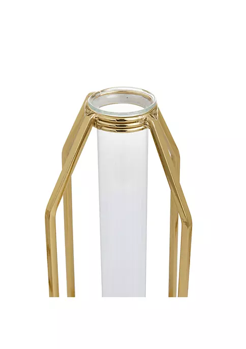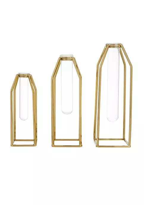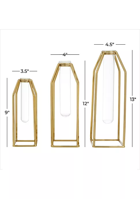 Elevate your space and add a touch of luxury with this glam inspired piece. This home decor is crafted with glass and stainless steel for a solid and durable form. This set of 3 bud vases highlight clear glass tube set on a metallic gold frame stand. Each bud tube vase is elegantly suspended from a stainless steel frame that adds character and personality to these flower vases. Each item measures 5″L x 5″W x 13″H , 4″L x 4″W x 12″H , 3″L x 3″W x 9″H and weighs 4 lbs