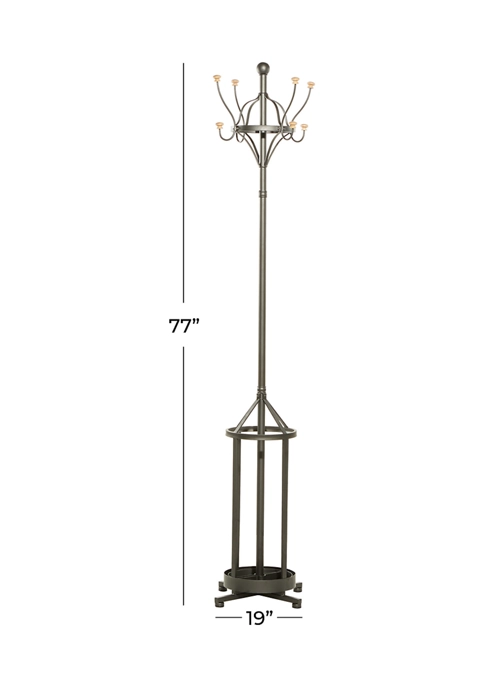Features an industrial inspired design to make your space unique. A tall coat rack with cylindrical base and splayed feet made of long-lasting iron and fir wood. This coat rack comes in a black finish, making it easy to match with any home decor or indoor planter. Featuring a finial and curved metal hangers with wooden tips, this rack can support your coats, small bags, caps, and umbrellas. Each item measures 76.75″ x 18.50″ x 18.50″, and weights 20.67 lbs.