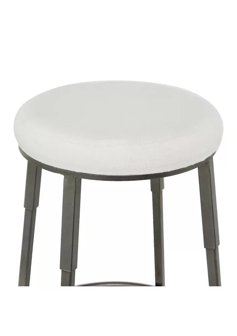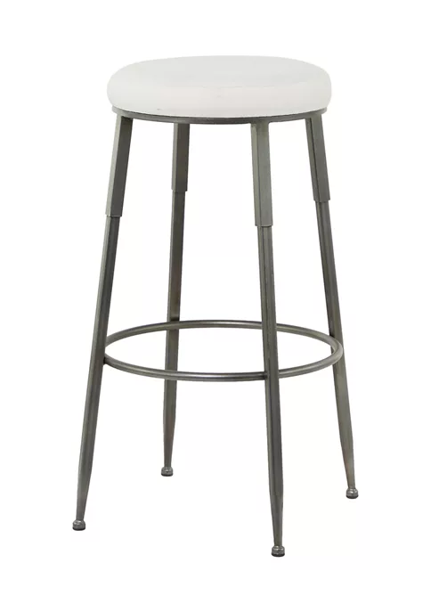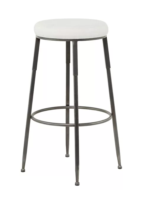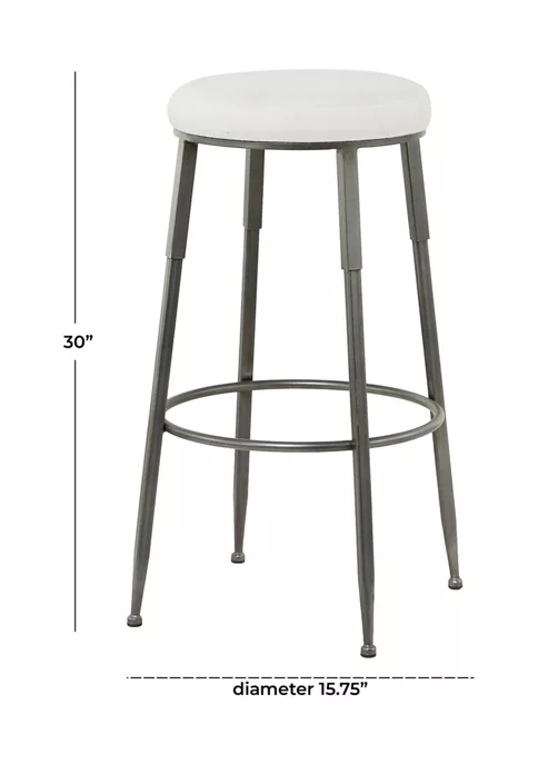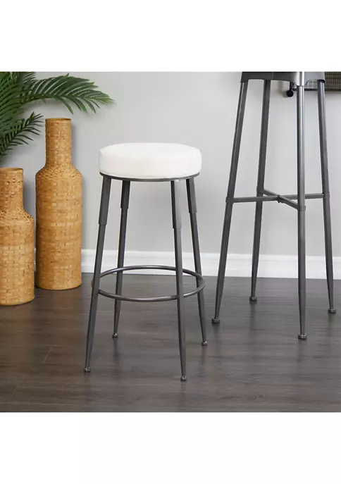 Features an industrial inspired design with clean lines and a structural appeal. Product is made of iron, cotton, and foam pad. Metallic gray finished legs and a soft white cushion seat highlights this tall metal stool features. An industrial bar stool that showcases a round white cushioned seat and a four-legged tripod style body with a circular ring foot rest for added comfort. Item measures 16″L x 16.2″W x 30″H and weighs 7.2 lbs