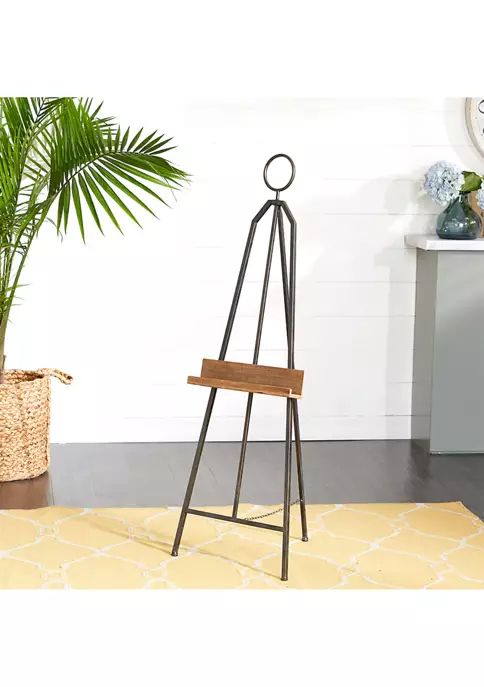 Features an industrial inspired design with clean lines and a structural appeal. Iron easel stand and chain with natural wood canvas holder/arm. Tall angled tripod base with a large circle finial, all painted in a black metal finish and black chain for retractable back leg. This industrial style inspired design black iron easel features a unique metal profile facade which is narrow up top and widens as it approaches the base. Industrial easel measures 19″L x 21″W x 66″H and weighs 8 lbs
