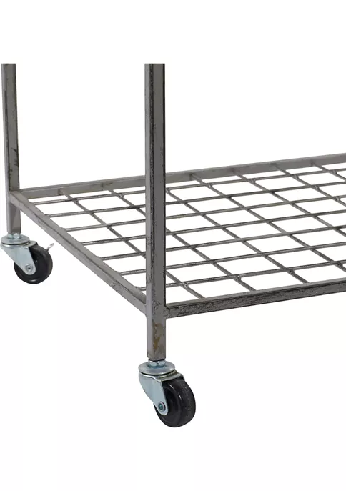 A new traditional rustic iron rolling storage basket, tapered rectangular gray iron frame basket with large square-weave wire sides and bottom, and a mounted on iron bar rectangular frame with square weave base shelf.
