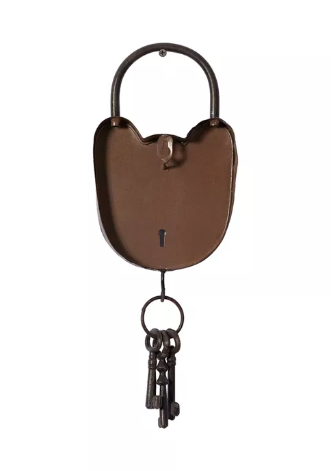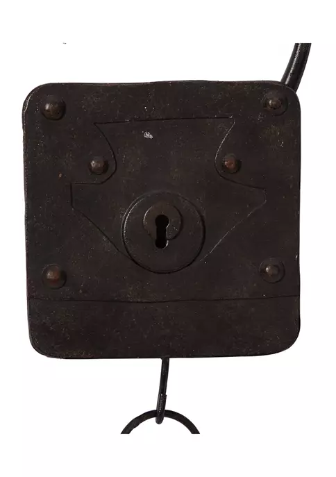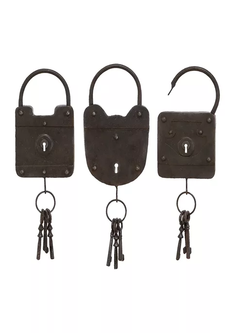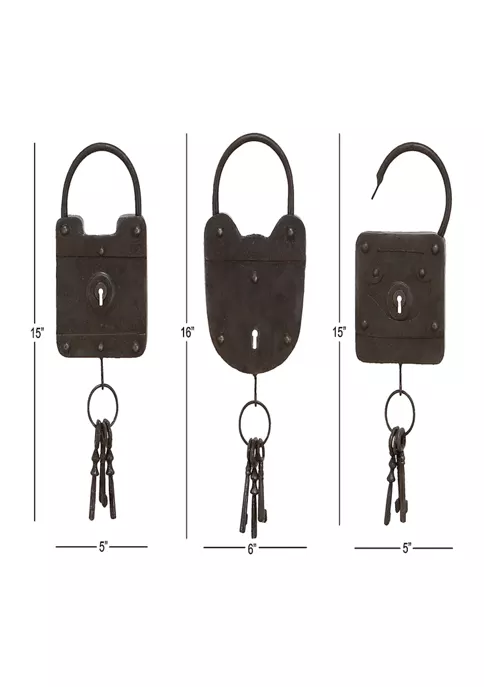 Features an industrial inspired design with clean lines and a structural appeal. This 3-set padlock wall decor is crafted from durable iron metal. This lock and key wall decor features an aged and semi-rusted black metal finish. Three padlocks with dangling sets of keys, features each lock comes in a various shape. Wall decor measures 6″L x 1″W x 16″H, 5″L x 1″W x 15″H, 5″L x 1″W x 15″H and weighs 1 lbs
