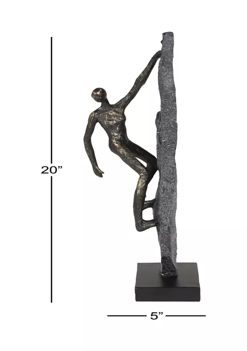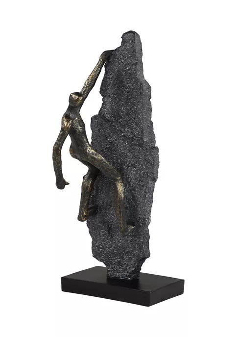 Features an industrial inspired design with clean lines and a structural appeal. Modern decor statue made from solid resin. The figure is painted matte dark gray with a matte metallic bronze finish. This table decor features a rock-inspired textured climbing wall that sits on a rectangular pedestal. This resin shelf decor statue measures 5.5”L x 5”W x 18.5”H and weighs 3 lbs