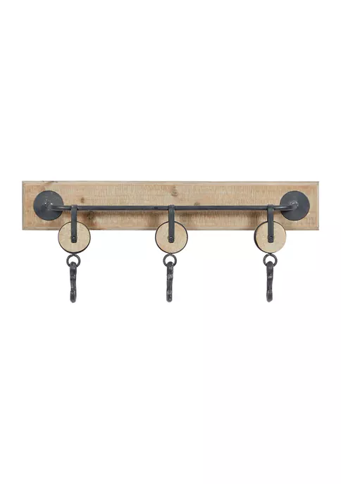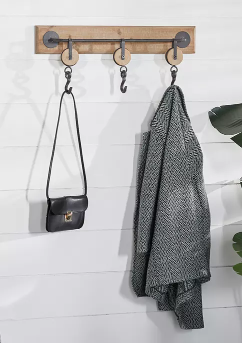 Features an industrial inspired design to make your space unique. This rustic wall organizer is made of a wooden wall mount and metal hook rack It features natural brown wall mount finish and iron grey rack finish. It conveniently comes with 3 metal swing hooks. It measures 24″L x 4″W x 10″H