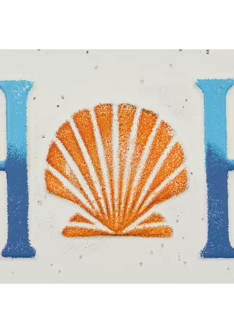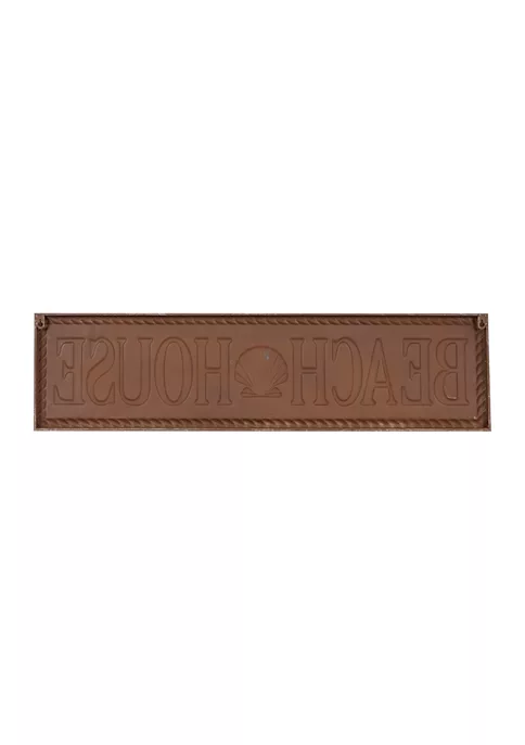 Designed with a coastal-inspired theme for a calming and relaxing vibe, this piece is made of solid iron for durability. Distressed white paint finishes with turquoise and blue lettering and a gold/orange seashell and solid iron with relief lettering look like a license plate.