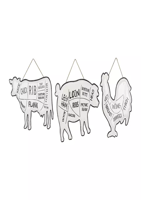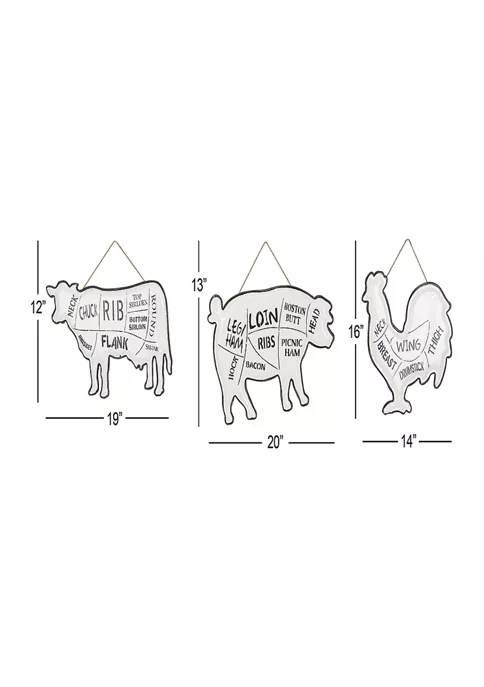 Set of three 14 in, 19 in, and 20 in Modern Reflections metal wall décor features a figure of cow, pig, and rooster with their worded body parts detailed on white finish