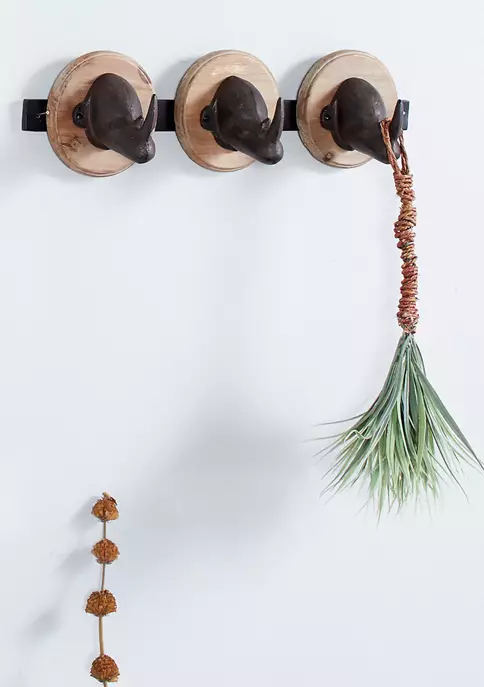 This metal rhino hook wall rack with wood backs and 3 hooks features iron rhino sculptures mounted to Chinese fir wood backs and an iron bar. The decorative coat hooks are sculpted into detailed brownish-black metal rhinoceros heads with hooked horns form 3 coat hooks; each rhino silhouette is mounted to a round, light beige, decorative wood wall mount with natural wood grain