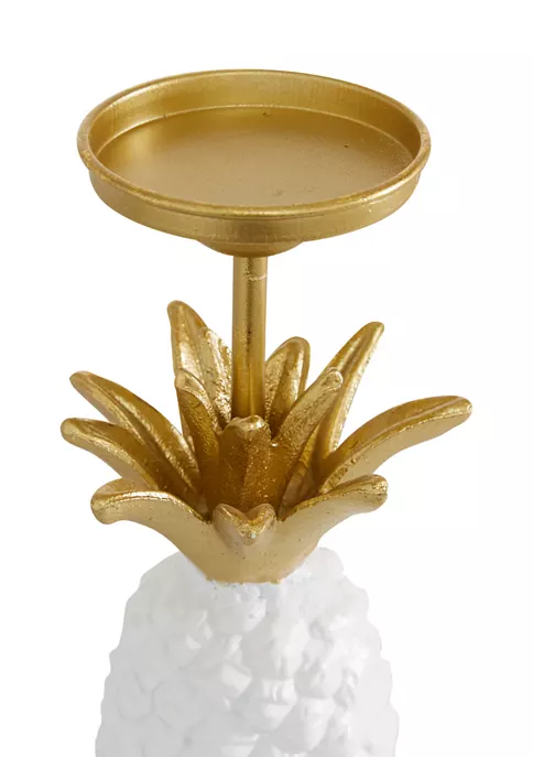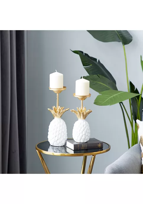 This candle holder set of 2 measures 4.5 in L x 4.6 in W x 13 in H, 4.7 in L x 4.3 in W x 10.5 in H and weighs 12 lb