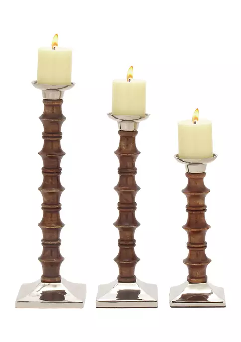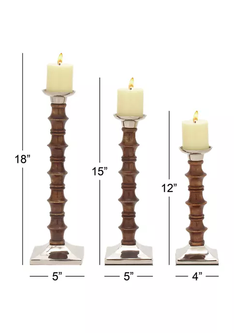 Each candle holder measures 5 in L x 5 in W x 12 in H, 5 in L x 5 in W x 15 in H, 5 in L x 5 in W x 18 in H, and weighs 5 lb