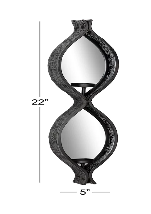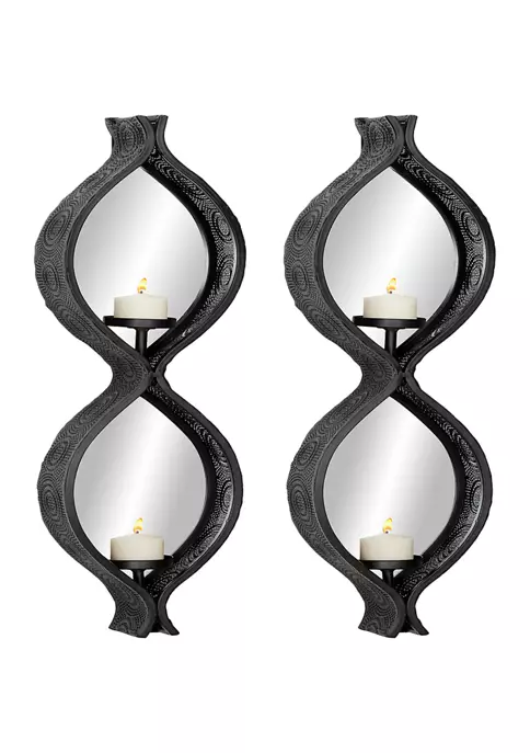 Pair of stacked pointed ellipse-shaped black metal wall sconces with mirrors and pillar candle holders. Solid iron mesh frames and candle holders with pointed ellipse mirror inlays. Solid black finish over the metal mesh wall sconces, each with two stacked pointed oval shapes forming a figure-eight silhouette with boho style lace-like textures; each black sconce has 2 metal pillar candle holders trays. Set of 2 metal wall décor lighting pieces measure 5 in L x 3 in W x 22 in H each and collectively weigh 3.6 lb. Easy and ready to vertically hang accent decor by the hardware in the back.