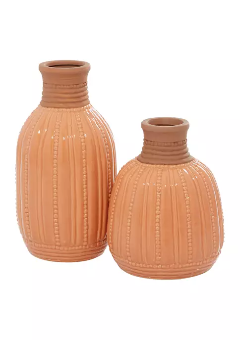 Modern style inspired with a minimalist design. Solid ceramic stoneware vases Matte terracotta uppers with glossy each bases. Rubber stoppers under bases prevent scuffing and sliding. Pair of peach vases measure 4.75″L x 4.75″W x 9″H, 5.25″L x 5.25″W x 7″H and collectively weigh 3.5 lbs.