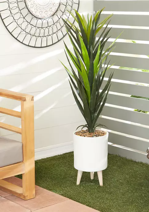 Features a modern style inspired by a minimalistic design with clean lines and angular structures. This artificial home decor floor plant is made of pure polyethylene material. This oversized artificial plant decor features a mix of green and yellow green leafy body with brown colored stones and a solid white pot with tan finished rubber wood legs. This delightful artificial plant in pot showcases a tall spiky leaf plant design with natural mixed stone fillers and a large round polyethylene pot with chic tripod rubber wood legs. Item measures 19″L x 19″W x 49″H and weighs 11 lbs