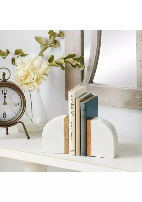 Features a modern style inspired by a minimalistic design with clean lines and angular structures. Layer of mango wood on the edge of each bookend with solid marble. Natural brown with marble white finish. Transform your living space with this elegant piece on your mantle, coffee table or console table. Each item measures 4″L X 2″W 5″H and weights 5 lbs