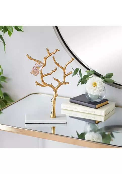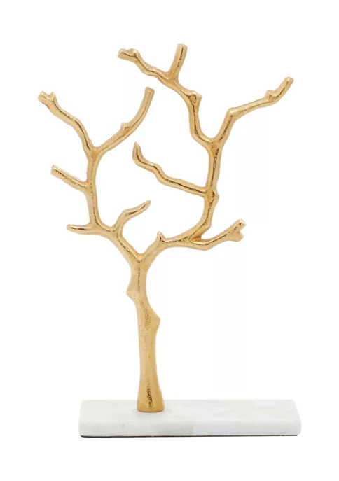 Modern style inspired by a minimalistic design with clean lines and angular structures. Jewelry stand features a solid marble base with aluminum frame. Jewelry holder features a semi shine gold finish with white marble base. Textural, metallic gold finish throughout leafless tree sculpture with various-sized branches to display jewelry; flat white and light gray marble base to hold rings. Measurements: 9″L x 3″W x 13″H, weight: 1.98 lbs