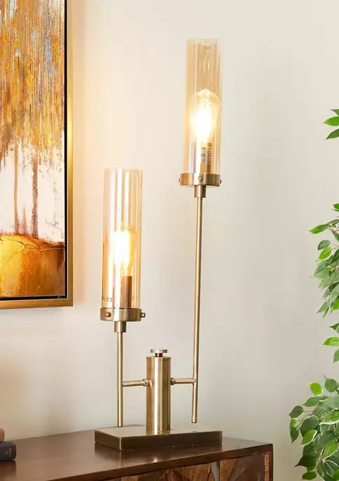 Features a modern style inspired by a minimalistic design with clean lines and angular structures. This home decor is crafted with metal and glass for a solid and durable form. This accent table lamp highlights a metallic gold finish with clear glass shade offering a soft sheen effect. A pair of glossy cylinder shade is projected from the frame of this table lamp that adds a touch of glimmer and magnifies its length. Accent lamp measures 9″L x 5″W x 33″H and weighs 6 lbs
