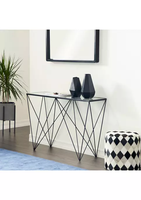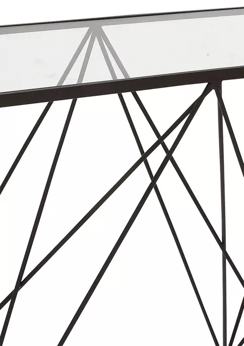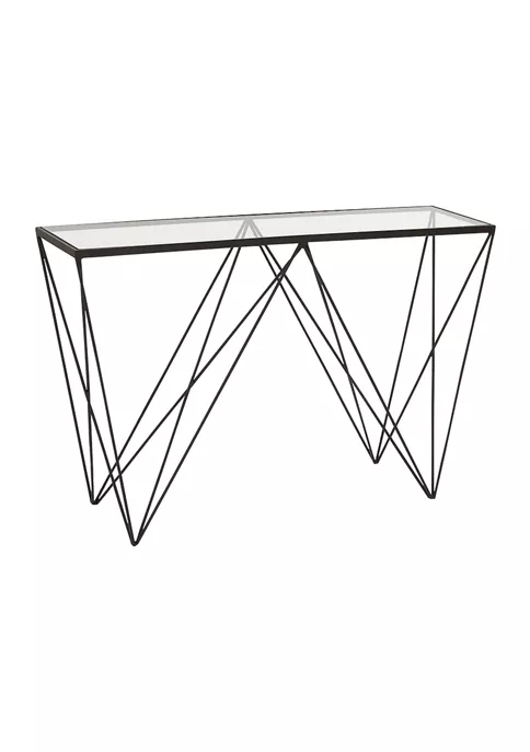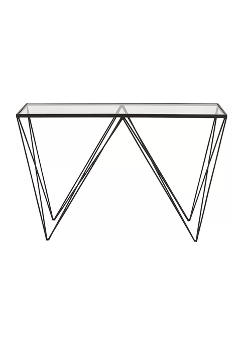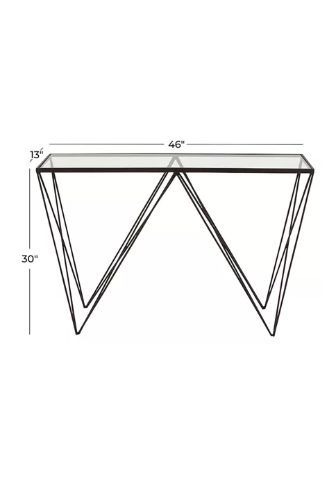 Features a modern style inspired by a minimalistic design with clean lines and angular structures. Black rectangular console table is made of iron frame with clear glass top. Metal console table has a matte black metal finish with clear glass surface. Rectangular console table highlights a spacious glass top and features a duo W-shaped base structure for an eye catching display. This metal table measures 46โL x 13โW x 30โH and weighs 24.64 lbs