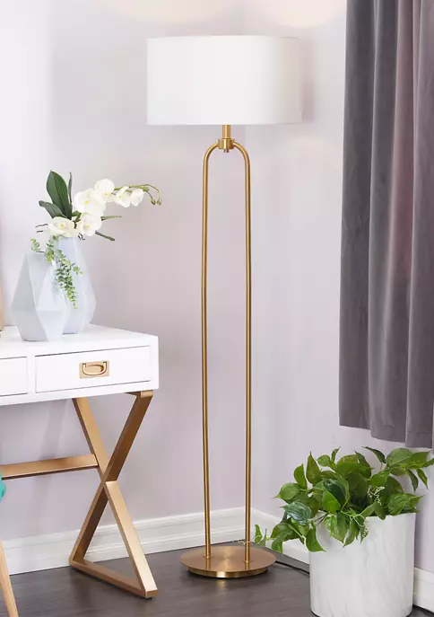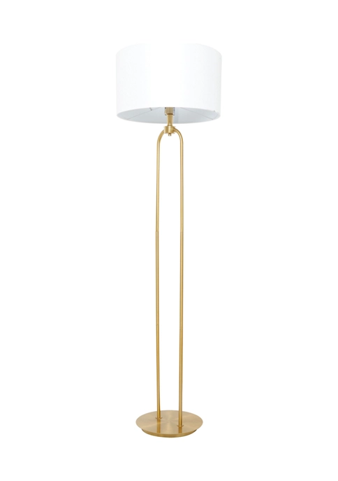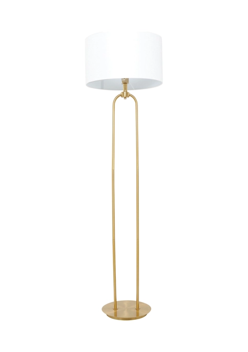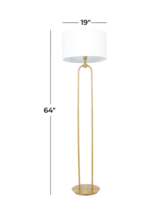 Features a modern style inspired by a minimalistic design with clean lines and angular structures. This large gold floor lamp is made of high quality linen fabric and robust iron metal. This tall modern floor lamp features a white linen drum shade and a high polished gold iron body and base. This modern white floor lamp showcases a large round linen drum shade and a tall, reversed U-shaped body structure with a round and thinly cut iron base stand. This lamp measures 19″L x 19″W x 64″H and weighs a total of 12 lbs, drum shade measures 18″D x 10″W