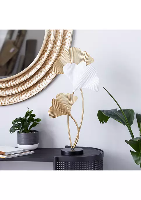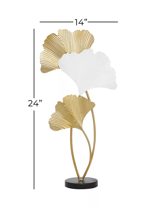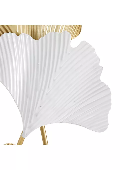 Features a modern style inspired by a minimalistic design with clean lines and angular structures. Made of a solid iron for durability. Features metallic gold and opaque white finish. Metal leaf sculpture table Decor, 3D sculpture with thin side profile to fit any space. Measures 14″L x 5″W x 24″H and weighs 2 lbs