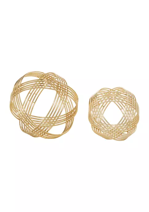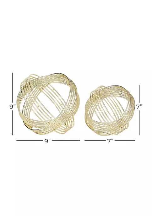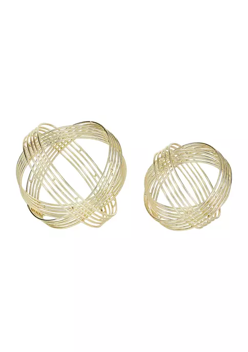 Modern style inspired with a minimalist designSlender yet sturdy iron rods were used in crafting these piecesA shiny gold finish coats the decorative orbs in this 2-in-1 setMetal rods forming large 4-ring orbs create table decorations that suit a white porcelain or matching gold trayDiameters: 8″, 6″; Weight: 3.84 lbs
