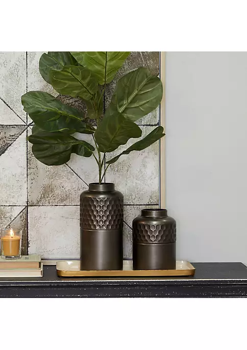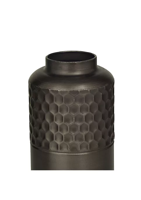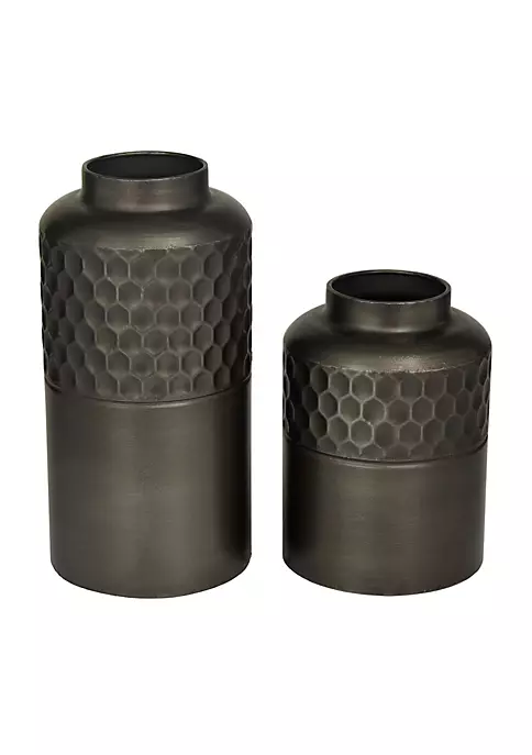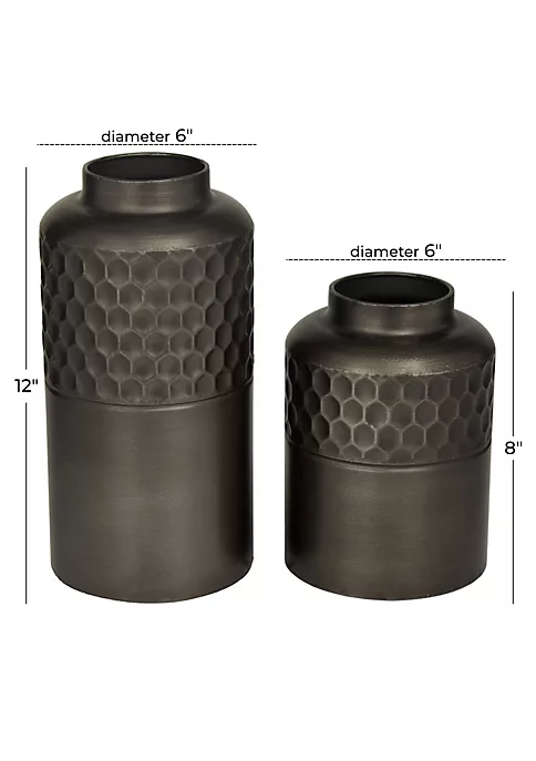 Features a modern style inspired by a minimalistic design with clean lines and angular structures. Iron gives this set of 2 vases a solid and durable form. Brushed dark gunmetal brown finish with faint sheen highlights these bud vases. Features a contrast of plain and honeycomb textured details for added character and style. Items measure 6″D x 12″H, 6″D x 8″H and both weigh 2 lbs