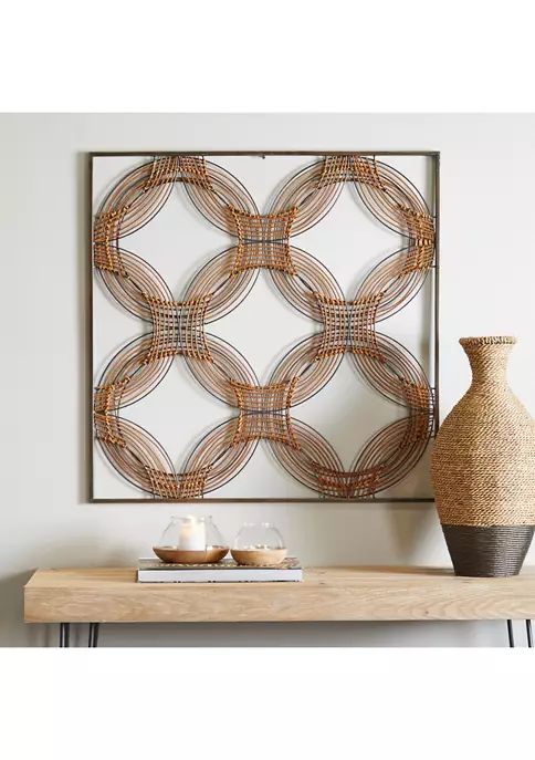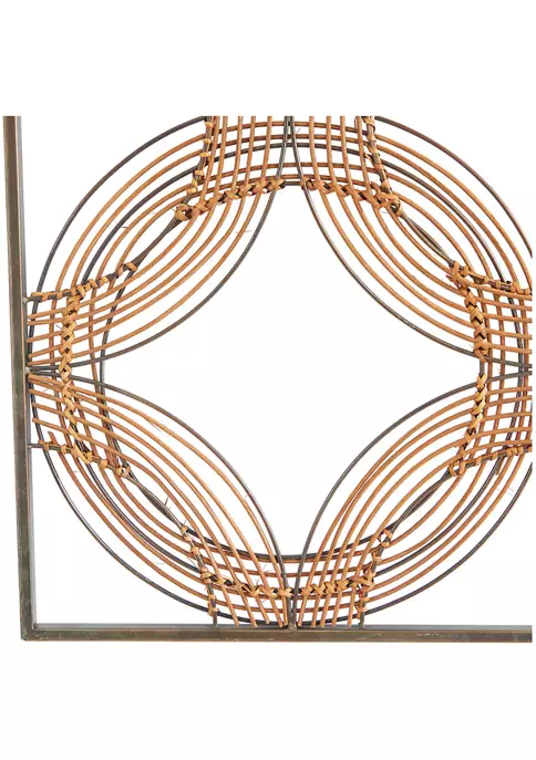 Features a modern style inspired by a minimalistic design with clean lines and angular structures. Rattan and iron elements featured in this modern wall decor create an enticing and durable piece. Distressed gray metal and natural wood brown finishes highlight this rattan wall decor. Rattan woven into a metal frame creates geometrical patterns for a dimensional look. Wall panels measure 32″L x 1″W x 32″H and weigh 6 lbs