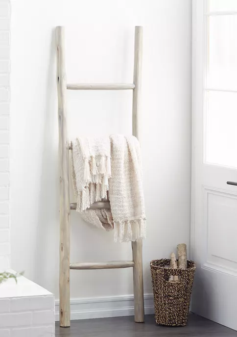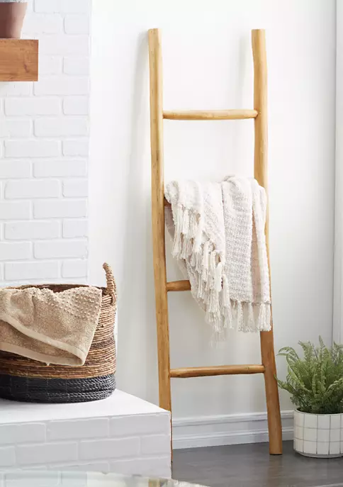 Designed with a natural theme for a calming and relaxing feeling. This rustic leaning towel rack ladder is made with 100% lacquered wood It features a light brown finish for that natural wooden look It is conveniently furnished with 5 rungs for towel racks. It measures 18″L x 2″W x 59″H