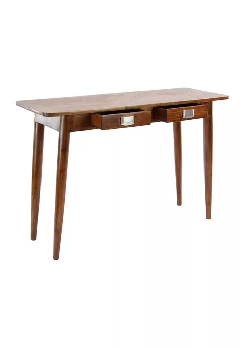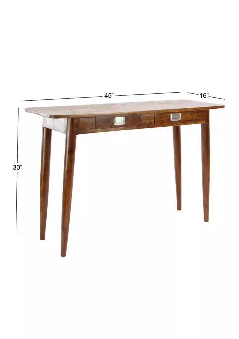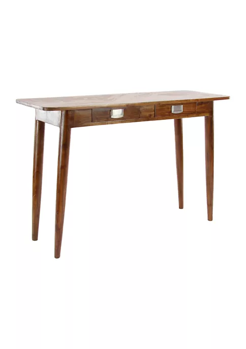 Modern style inspired by a minimalistic design with clean lines and angular structures. This sleek console table with drawers is crafted with solid Kanaloa wood. It highlights lacquered natural wood brown overall finish. To add a streamlined effect, it is designed with recessed drawer handles. This measures 45″L x 16″W x 29″H and weighs 23 lbs