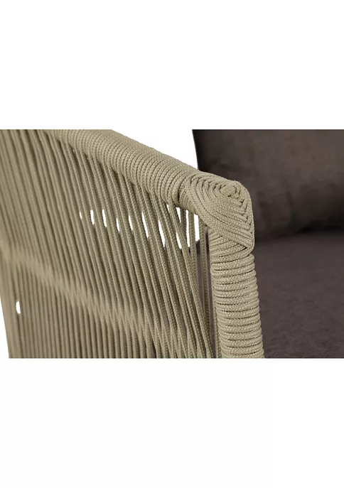 Features a modern style inspired by a minimalistic design with clean lines and angular structures. Patio side chair has a water-resistant aluminum seat covered in woven polypropylene rope, a polyester cushion, and 4 acacia wood legs. Outdoor accent chair carries beige rope with taupe grey, white cushion and brown wood legs. Modern outdoor lounge chair features a curved back that slopes down to a tapered armrest supported by fish bone woven rope, and complemented with detachable cushions for maximum comfort. This item measures 28.50″ x 330″ x 290″; and weights 200 lbs