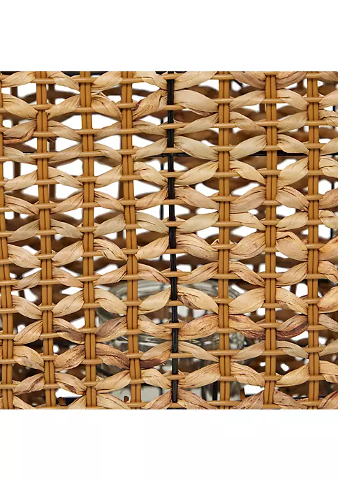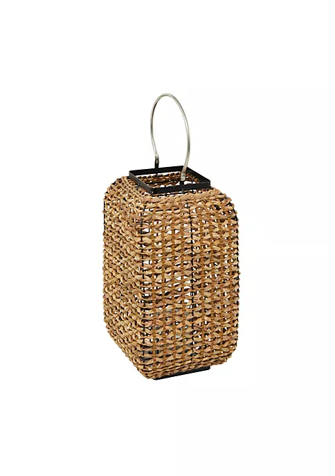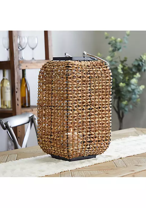Designed with a natural influence for a timeless style that brings a cozy and organic feel to the home. Round natural lantern is made of a cattail leaf, metal and stainless steel handle. Natural brown finish highlights the weave pattern of this wicker candle holder with black accent frame. Brown wicker candle holder lantern features wide and deep setting with hurricane glass for a secure display and complemented with long curved handles for easy transport. Item measures 13″L x 12″W x 20″H and weighs 4 lbs