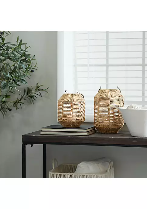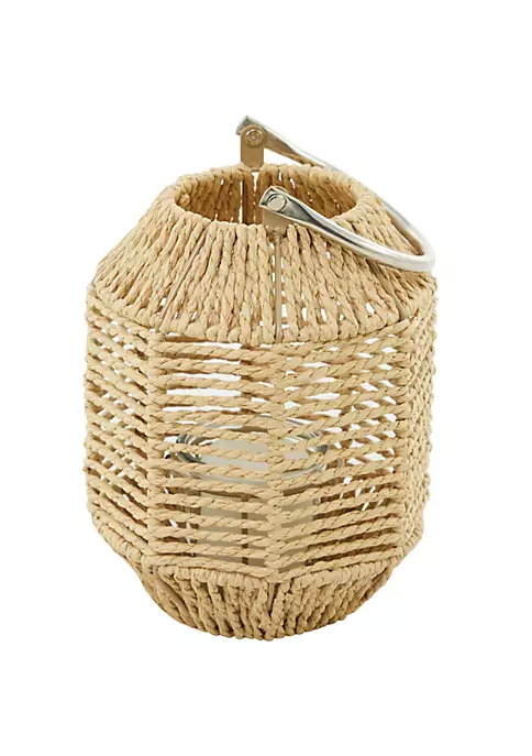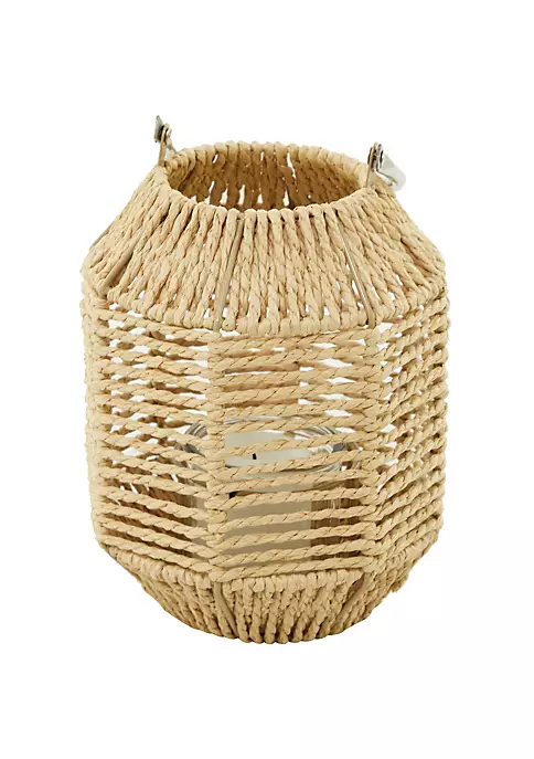 Designed with a natural influence for a timeless style that brings a cozy and organic feel to the home. Aesthetically pleasing woven candle lantern is made of paper rope, metal, stainless steel, and glass. Natural woven candle lantern features a brown hue that is perfect for a nature-inspired interior, along with a stainless steel handle. Functional candle lantern showcases a silver arched stainless steel handle and a brown woven faceted exterior, with a clear cylindrical glass inside to keep pillar candles in place. Candle lantern with glass measures 7βD x 9βH and weighs 1 lb