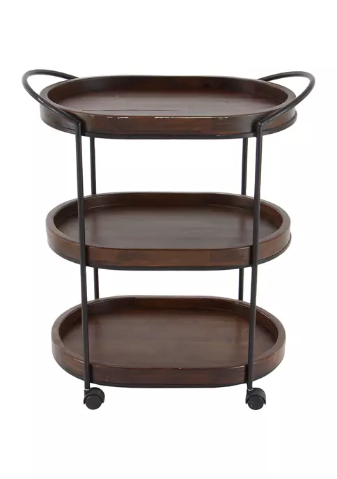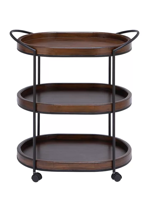 A classic and timeless style of design for your traditional home setting. Three tier serving cart is made of pine wood and supported by an iron frame. Metal and wood bar cart carries a natural dark brown wood finish with black iron frames. Dark brown rolling bar cart carries an oval tray shelves in a 3-tiered structure with curved handle bars on each side and supported by smooth caster wheels for optimal storage. This item measures 3-tier rolling cart with shelves measures 25”L x 16”W x 30”H and weighs 15 lbs